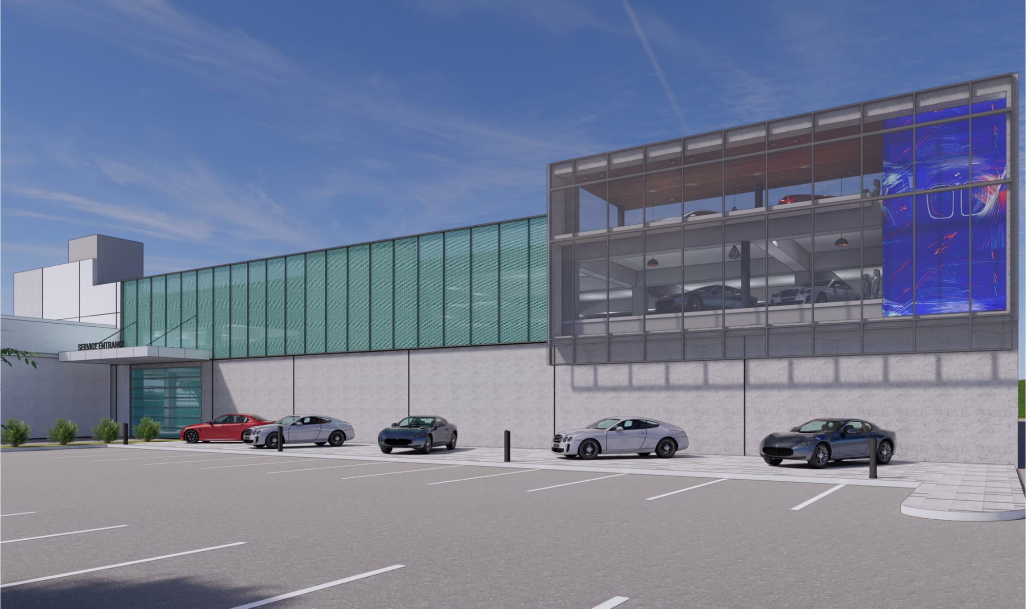 Ware Malcomb is the architect behind the modern design, which features a sophisticated palette intended to elevate the dealershipβs presence. Renderings show a structure finished in Pure White and gray smooth stucco, accented by Tantalizing Teal perforated metal rounds and bone white aluminum. The building will reach a maximum height of 45 feet, according to the projectβs development standards.