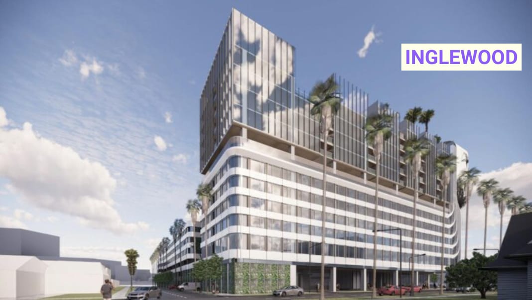 Inglewood city officials have approved a 13-story hybrid development at 4200 West Century Boulevard that will replace the former Tradewinds Hotel. This 335,000-square-foot project features a unique mix of 175 hotel rooms, 118 extended-stay units, and 11 luxury condominiums located just minutes from SoFi Stadium and Intuit Dome. Designed by CallisonRTKL, the contemporary mid-rise will include a 915-car garage and integrated digital signage to cater to the area's massive event crowds.